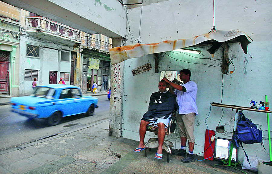 В районе Гавана-Центр, что недалеко от Старого города, те же колониальные, наполовину обрушившиеся дома, только улицы пошире и ни одного европейца. 36-летний Лесване, работающий охранником в одном из крупных отелей, принимает нас в своем доме с высокими, спасающими от 50-градусной летней жары потолками. После революционного для Кубы 1959 года бабушка и дедушка Лесване (ткач и портниха) были вынуждены делиться: большую часть дома власти отдали «бедным», оставив семье лишь две комнаты общей площадью метров 15. Чтобы как-то разместиться с мамой и женой, Лесване разделил комнаты по горизонтали, сделав два этажа. «Окон наверху нет, но в жару даже и лучше», — хвастается хозяин. Горячей воды в доме нет, электричество время от времени отключается, на кухне газовая плитка на баллонах и купленная 25 лет назад стиральная машинка «Эврика», в гостиной — древний продавленный диван, колченогие стулья, вытертые коврики на полу. Старый кинескопный телевизор почему-то бодро рекламирует по-английски ВВС США: «Приходите к нам. Наша армия борется за свободу и демократию во всем мире». Поймав удивленный взгляд автора, Лесване поясняет: «Кабельное ТВ. На сериалах ставят титры на испанском, а рекламу так оставляют».