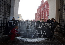 Три левых активиста в годовщину президентских выборов провели акцию прямого действия у Иверских ворот на Красной площади. Как сообщает "Новая газета", они приковались наручниками к решеткам ворот и развернули баннер "Долой царя Путина". Через 10 минут все трое были задержаны полицейскими и доставлены в ОВД "Китай-город". Как передает "ОВД-инфо", на активистов оформили протоколы по статье 20.2 КоАП (нарушение порядка проведения массовых акций), после чего отпустили.