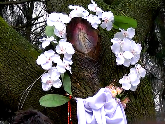 Срезанную ветвь с красным пятном украсили венком и полотенцем. Люди молятся, плачут, целуют дерево, фотографируются.