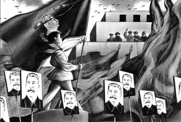 Отдельно – об иллюстрациях, которых в книге ненамного меньше, сколько текста. Анне Наринской, критиковавшей литературные достоинства текста при всей уверенности в необходимости этой книги, и картинки тоже показались неудачными. Однако в них есть очень тонкая игра, отчасти, как мне кажется, связанная с биографией автора, и создающая определенный смысловой эффект. Иллюстрации сделаны автором текста Евгением Ельчиным – он по профессии художник, учился в Ленинграде, и в 1983 году, когда ему было 27 лет, уехал в Америку, где работал в рекламе. «Сталинский нос» был переведен и издан во многих странах, особенно он популярен в Южной Корее, возможно, как пошутил модератор дискуссии Александр Гаврилов, директор Института книги, был бы еще больше востребован в Северной, но… Международно понятным языком сегодня стал Голливуд. В ракурсах занесенной над головой мальчика руки кремлевского охранника, взгляде на лестничный колодец с верхней площадки, а внизу уже бегут арестовывать – видится раскадровка фильма. В голливудском кино даже нищета не имеет права быть некрасивой - потому и тусклая лампочка на коммунальной кухне играет привлекательными лучиками, будто снятыми через специальный фильтр, который часто используют в рекламных роликах. Но блеск на холеных боках воронков, мчащих через снежную ночь, сияющие сапоги работников НКВД, вкусный глянец пионерского галстука – это еще и об эстетизации политики, визуальном празднике террора, который, как показал опрос ВЦИОМ, до сих пор манит треть населения России.