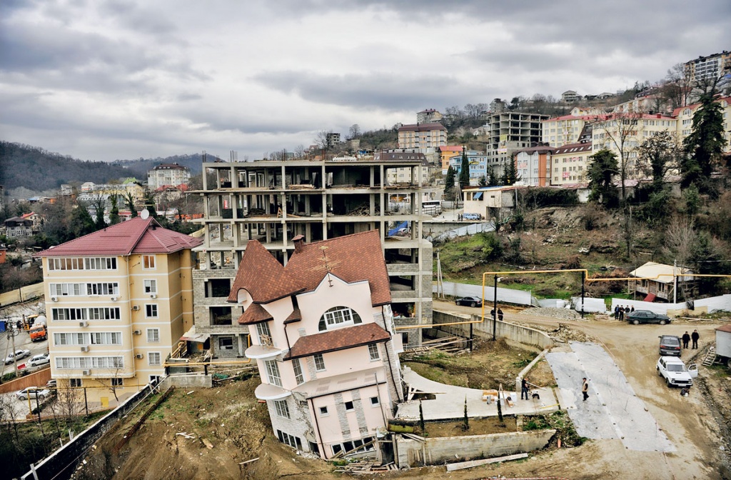 Очередной туннель и очередной обвал: теперь в районе строительства дублера Курортного проспекта. В результате просел и покосился трехэтажный дом, который находится аккурат над тем местом, где строится туннель. Только в отличие от итальянской Пизы, где башня стала местом притяжения для туристов, подобные картинки из Сочи вряд ли добавят уверенности спортсменам и тем, кто готов заплатить бешеные деньги за билеты на соревнования. Почему «поехал» дом? «Грунт», — отвечают специалисты. «А что с грунтом?» — «Он мокрый», — отвечают они. «А почему мокрый?» — «Не сделан нормальный водоотвод, а также допущены нарушения при строительстве дома». А при строительстве стадиона, где будет проходить открытие Игр, на трамплинах и бобслейных