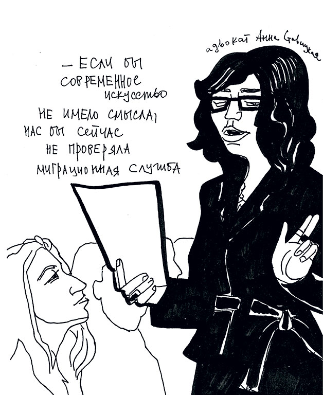 «Я объясняла присяжным смысл статей, которые инкриминировались нашим обвиняемым. Кураторов выставок обвиняли по ст. 282 УК РФ — разжигание ненависти или вражды, а равно в унижении человеческого достоинства по признакам отношения к религии, Pussy Riot по ст. 213 УК РФ — хулиганство по мотивам религиозной розни или вражды. Я объяснила им, что в действиях обвиняемых не было умысла на разжигание ненависти или вражды по признакам отношения к религии. Вообще на этом процессе больше всего меня поразили свидетели обвинения. Когда я участвовала в реальных процессах по делу «Осторожно, религия!», «Запретное искусство», то туда приходили люди, которые поддерживали обвинение, не очень понимая, о чем они говорят, что именно их оскорбило и почему. На этот же процесс пришли те, которые имеют определенную идеологию. Они называют себя православными верующими, но проповедуют воинствующее православие. И это страшно».