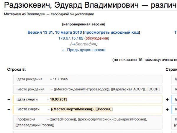 Радзюкевич пожаловался на то, что пресса «раздула из мухи» слона, напугав при этом его 83-летнего отца, который живет в Петербурге. «Мне уже позвонил мой коллега Александр Жигалкин и рассказал, что в "Википедии" пять минут висела информация о том, что я скончался… Со мной все нормально», — добавил актер. В самом деле, такая правка была сделана вчера каким-то доброжелательным юзером, судя по IP, из Петербурга (см. скриншот выше), но ее вскоре откатили с комментарием: "Он еще жив".