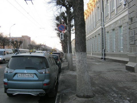 У здания правительства Рязанской области на улице Ленина установлен знак 3.28 ПДД РФ, запрещающий стоянку автомобилей, а у горадминистрации (Радищева, 28) установлен знак 3.30 ПДД РФ, запрещающий стоянку автомобилей по четным числам месяца. Однако в обоих случаях предписания знаков откровенно игнорируются.