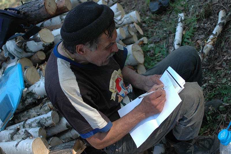 Надо вам сказать, что в доме, кроме стайки мышек на террасе, тихо стрекочущих жуков-короедов в стенах и меня, никого больше не было — ребята были на просеке, заповедный народ — весь в работе, и даже волонтерский детеныш грыз науку в деревенской школе. Я же готовила обед, убиралась, дозванивалась до Москвы в поисках новых добровольцев, в общем, делала все то, что и положено делать координатору лагеря. Боязно, однако, оставаться один на один с непонятным бродягой... вроде спит, а в руках крутит какую-то железяку.... Тетрадки его, исписанные мелким почерком и изрисованные непонятными символами и знаками... А слог хорош, и грамотность безупречная, и смысл понятен. Идеи развития государства, человеческие типажи, особенности тех или иных мест... "Что с пальцем-то?" — внезапный вопрос заставил вздрогнуть и вспомнить про ноющий палец, который за несколько часов до этого я так сильно прихлопнула дверцей морозилки, что врач наложил шину и уверенно сказал — перелом, деточка.