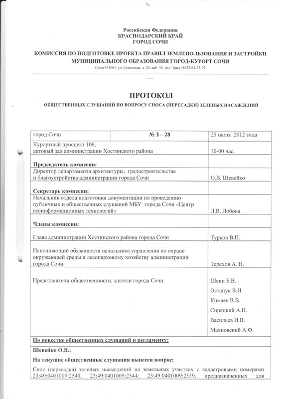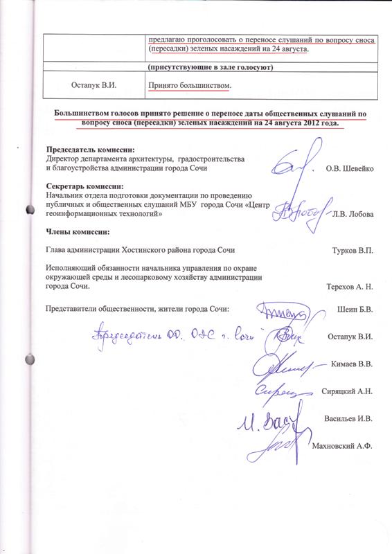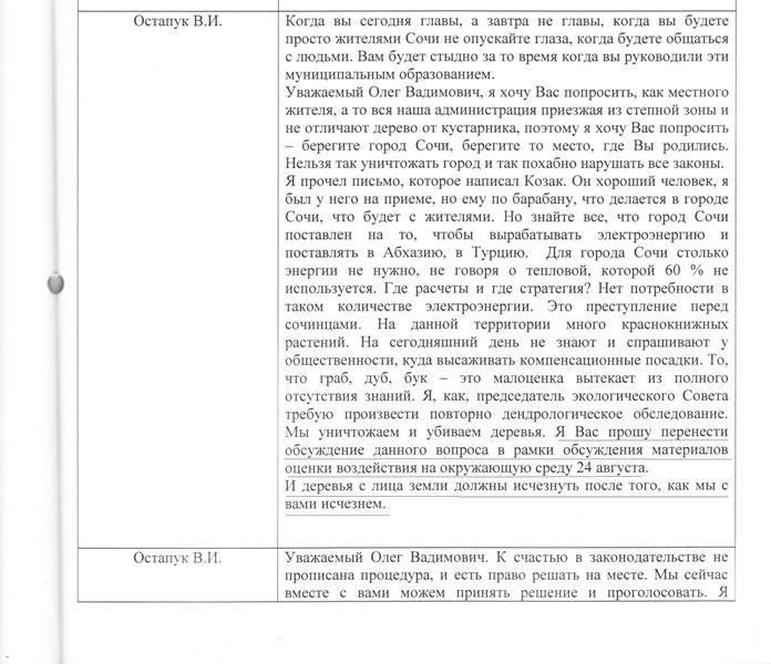 Ими была вызвана полиция и приготовлены для сотрудников Адлерского РОВД документы, в частности: порубочный билет, где указан срок действия 31.12.2012 года и протокол общественных слушаний по вырубке зеленых насаждений, где ясно сказано о переносе слушаний на 24 августа 2012 года к слушаниям по оценке воздействия на окружающую среду кудепстинской ТЭС.