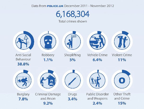 Полиция БританииКомпромиссное решение состоит в том, чтобы указывать место не точно, а приблизительно — скажем, соседнюю улицу. Какое-то представление о распределении преступности по городу получить можно, но насколько велика погрешность в публикации Guardian на основе этих данных«100 самых криминальных улиц», без дополнительных подтверждающих источников судить трудно.