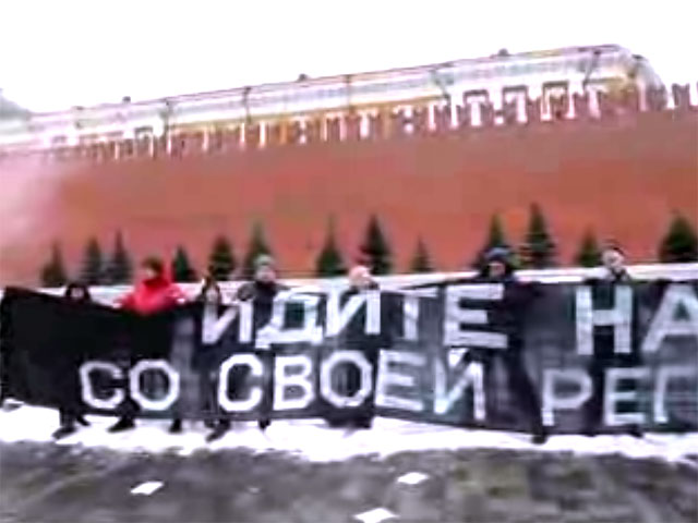 15 человек протестовавших держали большой черный транспарант, на котором белыми буквами было написано: "Идите на *** со своей регистрацией". Они расположились у мавзолея и, помимо прочего, зажгли файеры, сообщает сайт "Грани.ру".