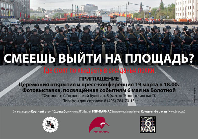 Фотовыставка, посвященная событиям 6 мая на Болотной площади, будет открыта в Фотоцентре на Гоголевском бульваре с 20 по 28 марта, ежедневно кроме понедельника, с 11 до 19 часов.