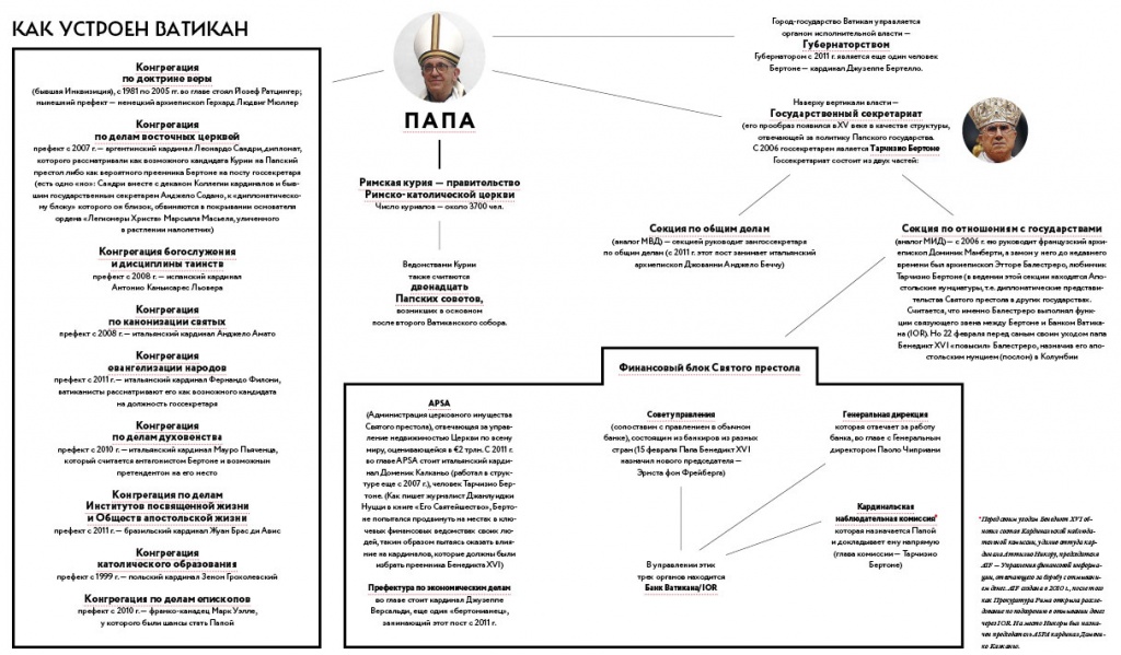 *Перед своим уходом Бенедикт XVI обновил состав Кардинальской наблюдательной комиссии, удалив оттуда кардинала Аттилио Никору, председателя AIF — Управления финансовой информации, отвечающего за борьбу с отмыванием денег. AIF создана в 2010 г., после того как Прокуратура Рима открыла расследование по подозрению в отмывании денег через IOR. На место Никоры был назначен председатель ASPA кардинал Доменико Калканьо. Нажмите, чтобы увеличить картинку