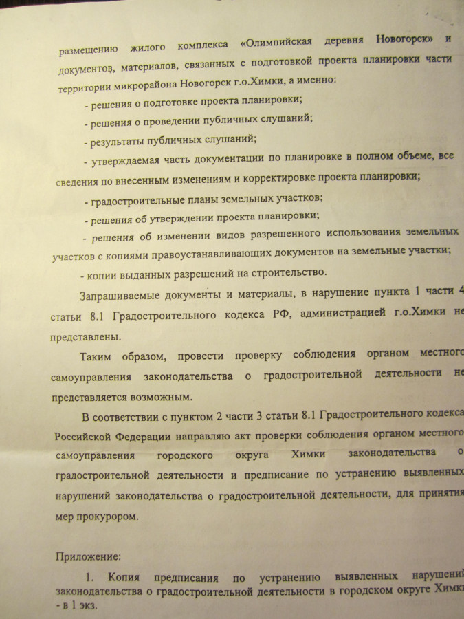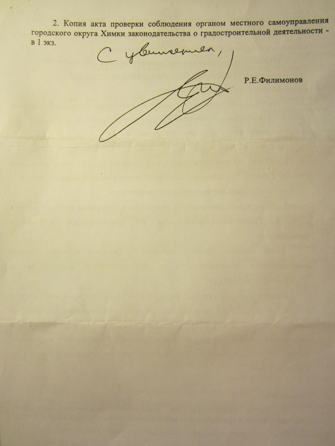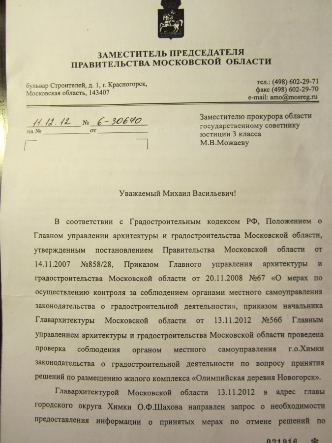 Но администрация Химок не только лицемерно заявляет об отсутствии каких-либо претензий к застройщику поймы Сходни, но и фактически покрывает его. Ниже мы приводим документы, проливающие свет на реальное положение дел. Главархитектура Московской области даже не может получить по своему законному требованию от администрации Химок документов, необходимых для проверки законности застройки поймы Сходни. В результате чего Главархитектура вынуждена обратиться в правительство Московской области с жалобой на нарушение со стороны Олега Шахова градостроительного законодательства. Но и областное правительство не указ бывшему подчиненному олигарха Усманова, жена и пасынок которого сейчас застраивают пойму Сходни. Поэтому областное правительство жалуется уже в прокуратуру на действия химкинских чиновников. Ниже мы приводим текст письма заместителя председателя правительства Московской области Филимонова Р.Е. на имя заместителя прокурора области Можаева М.В.