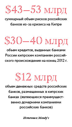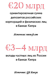 На кипрских счетах лежит порядка €68 млрд. Из них €43 млрд принадлежит киприотам (€26,2 млрд — частным лицам и €9,3 млрд — компаниям), а порядка €18–20 млрд — россиянам, причем, по разным оценкам, €3–4 млрд из них — это вклады частных лиц. Впрочем, сумма якобы чисто кипрских денег вызывает сомнение. Как объяснил The New Times владелец одной из кипрских юридических компаний, проследить, кто реально стоит за этими деньгами, невозможно. Компания может быть зарегистрирована на Кипре, но ее реальные владельцы — опять-таки в России. То же и с частным капиталом: у многих миллионеров, в том числе и русских, двойное гражданство и работают они не на Кипре, а в России.
