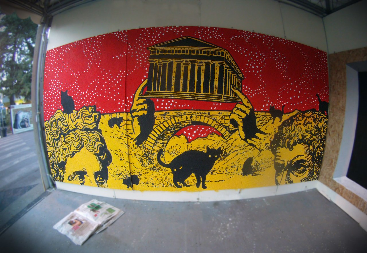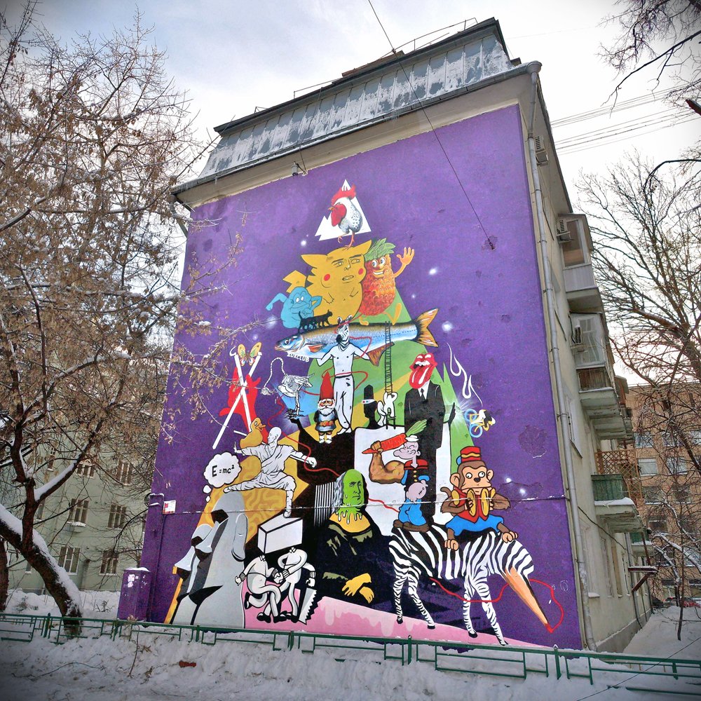 С: Мы делали огромную стенку на набережной по заказу Музея современного искусства. Работа называлась "Богема" — рисовали разные божества. Семиэтажный дом порядка 2000 кв. метров — мы за неделю его сделали. Эта работа и в СМИ прогремела, и местная РПЦ жаловалась — что там будто бы какой-то подтекст, что мы оскорбили кого-то. Хотя у нас не было таких задач. Но каждый видит то, что хочет. Это больше пиар был, я так предполагаю.