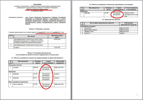 Не хватает только одного документа: декларации о доходах и имуществе члена Совета Федерации РФ, видного единоросса Михаила Маргелова, где были бы указаны эти самые две квартиры в штате Флорида, США, которыми он владеет. Это могла бы быть любая из деклараций, которые Михаил Маргелов составлял, подписывал и сдавал в 2009, 2010, 2011 и 2012 годах.