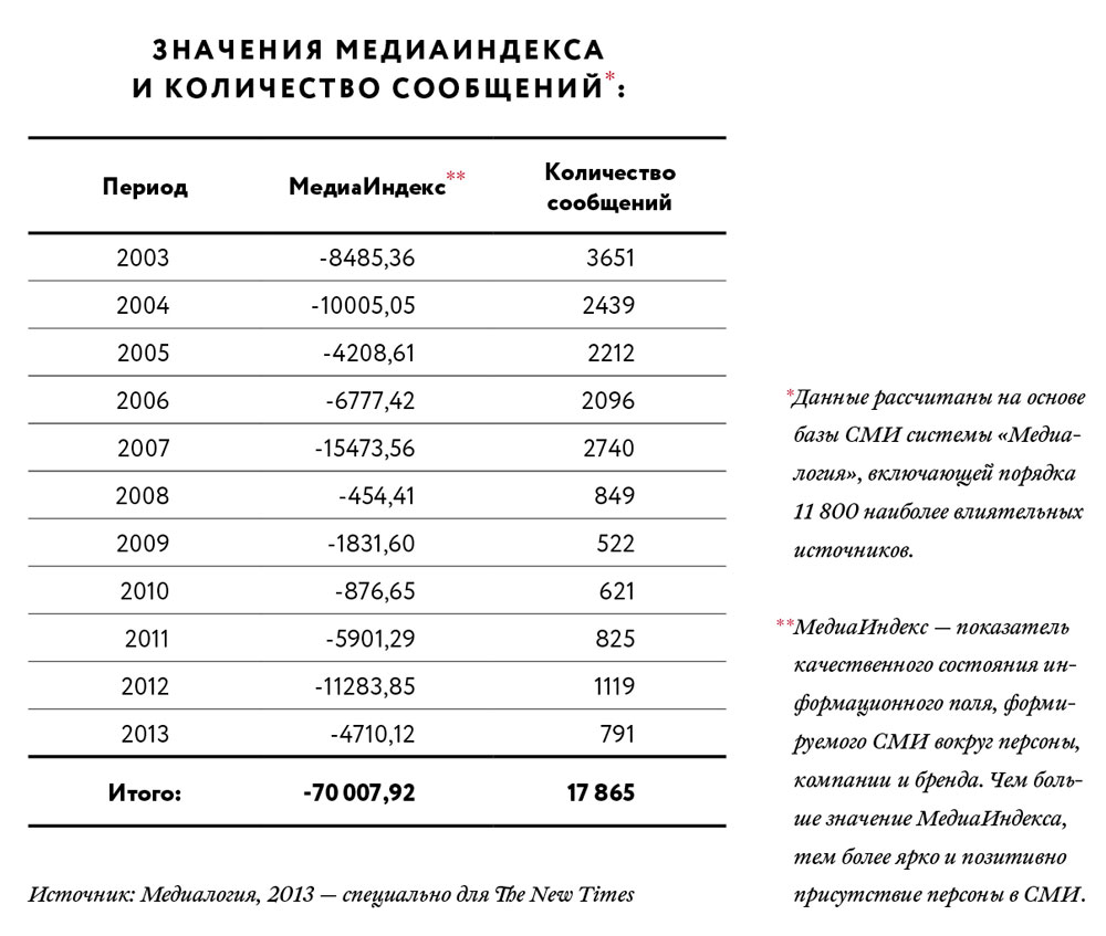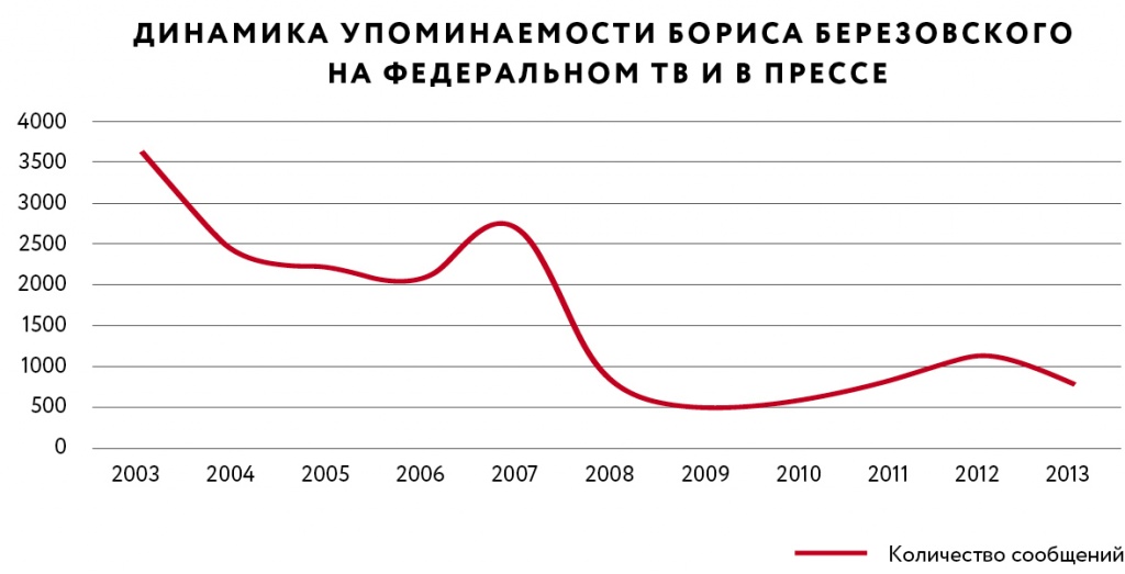Все эти годы Кремль держал опального бизнесмена в медиапространстве. Пики упоминаемости Березовского в российских СМИ пришлись на 2007 и 2012 годы, когда на него заводились громкие уголовные дела, в том числе и о «захвате власти»