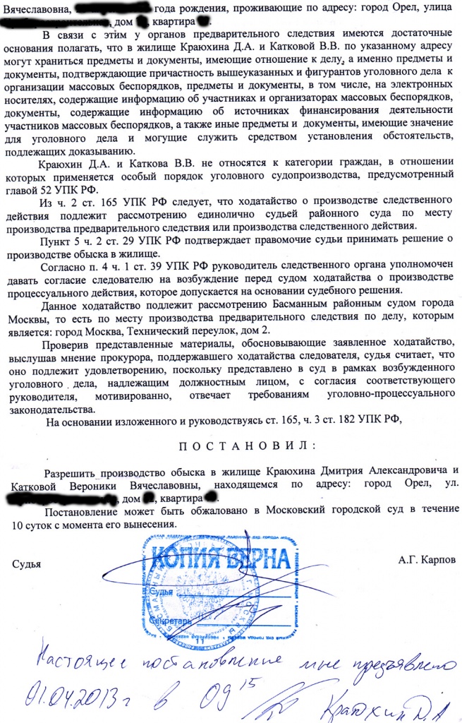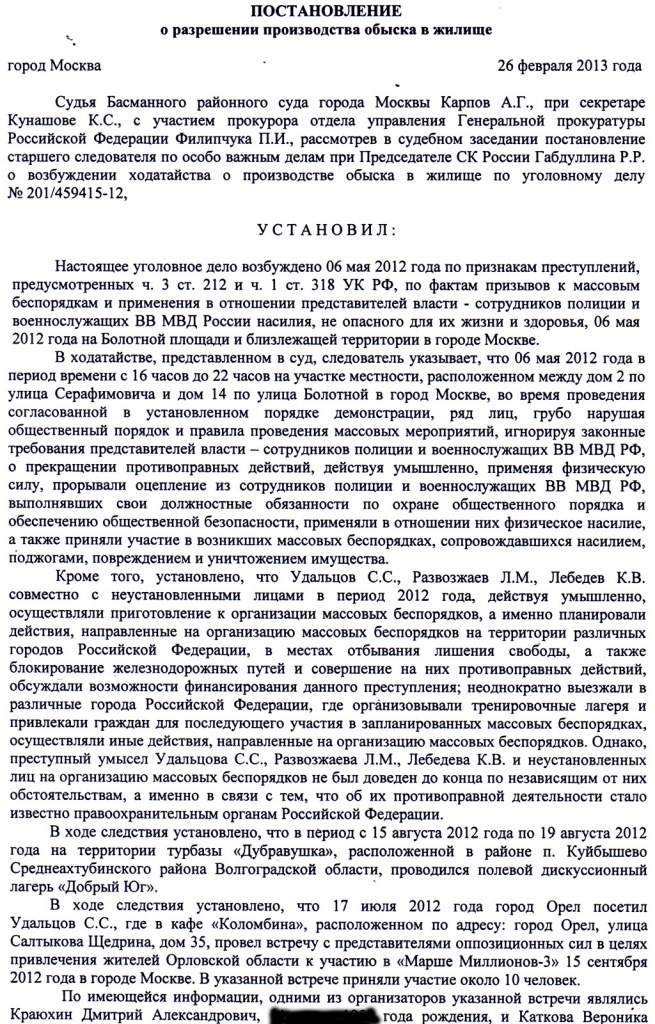 1 апреля сотрудники Следственного комитета провели обыски у новосибирского оппозиционера Дмитрия Терехина и орловских правозащитников Вероники Катковой и Дмитрия Краюхина. Следователей интересовали материалы о контактах активистов с лидером «Левого фронта» Сергеем Удальцовым, обвиняемым в организации массовых беспорядков на Болотной площади 6 мая прошлого года. Правда, как следует из документа, размещенного Краюхиным в своем ЖЖ, Каткова и Краюхин встречались с Удальцовым 17 июля, то есть через два с лишним месяца после так называемых «беспорядков». Тем не менее Басманный суд Москвы противоречий в аргументах СК не увидел и обыски санкционировал.