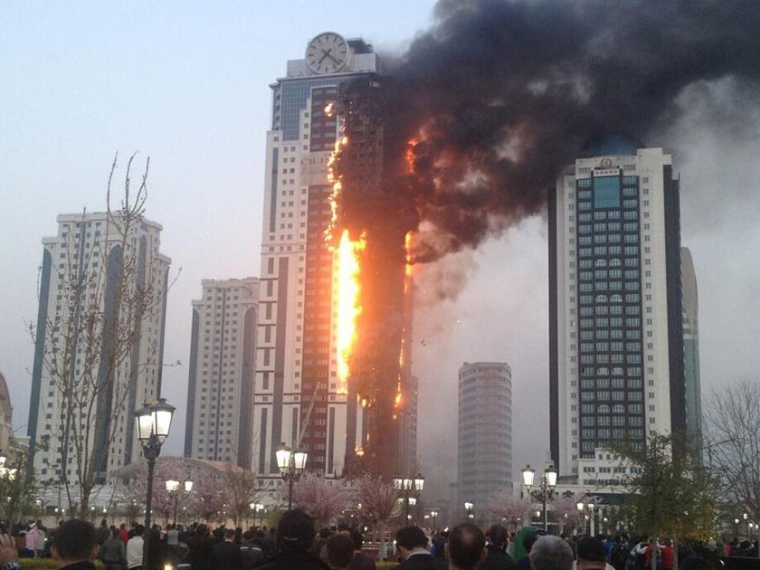 На момент написания этой заметки пожар, возникший в среду в 40-этажном доме «Олимп», самом высоком из зданий комплекса «Грозный-сити», охватил все этажи кроме первого. Высотка полностью окутана черным дымом, из окон вырывается пламя. С огнем борются более ста пожарных расчетов: 285 человек и 68 единиц техники.