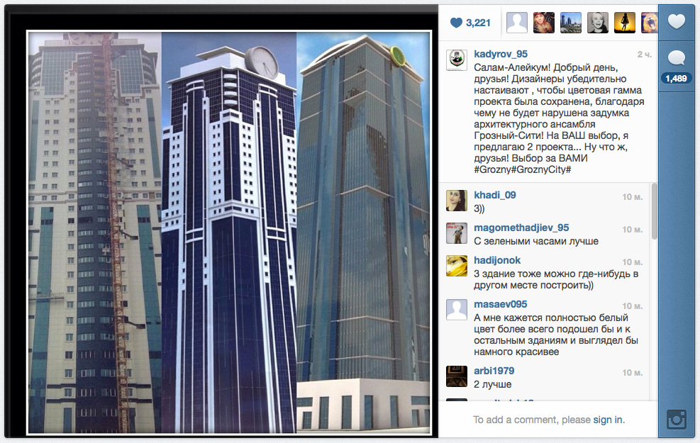 Глава Чеченской Республики Рамзан Кадыров выбрал дизайн оформления сгоревшей в Грозном 3 апреля высотки "Олимп" с помощью своих читателей в Instagram.