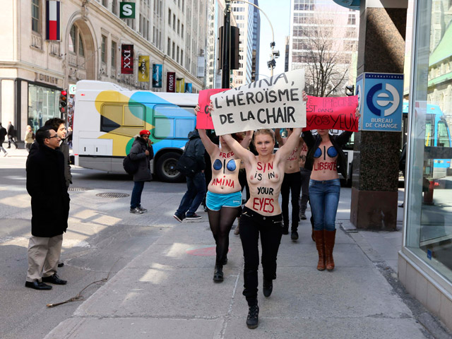 Против "секс-джихада" опосредованно выступили также активистки Femen, объявившие "топлес-джихад" в знак протеста против преследования своей тунисской соратницы Амины Тайлер. Девушка, напомним, опубликовала в соцсети свою фотографию в полуобнаженном виде. Но одном снимке на теле было написано по-арабски: "Мое тело принадлежит только мне и не представляет чью бы то ни было честь". На другом - по-английски: "Е**** я вашу мораль".