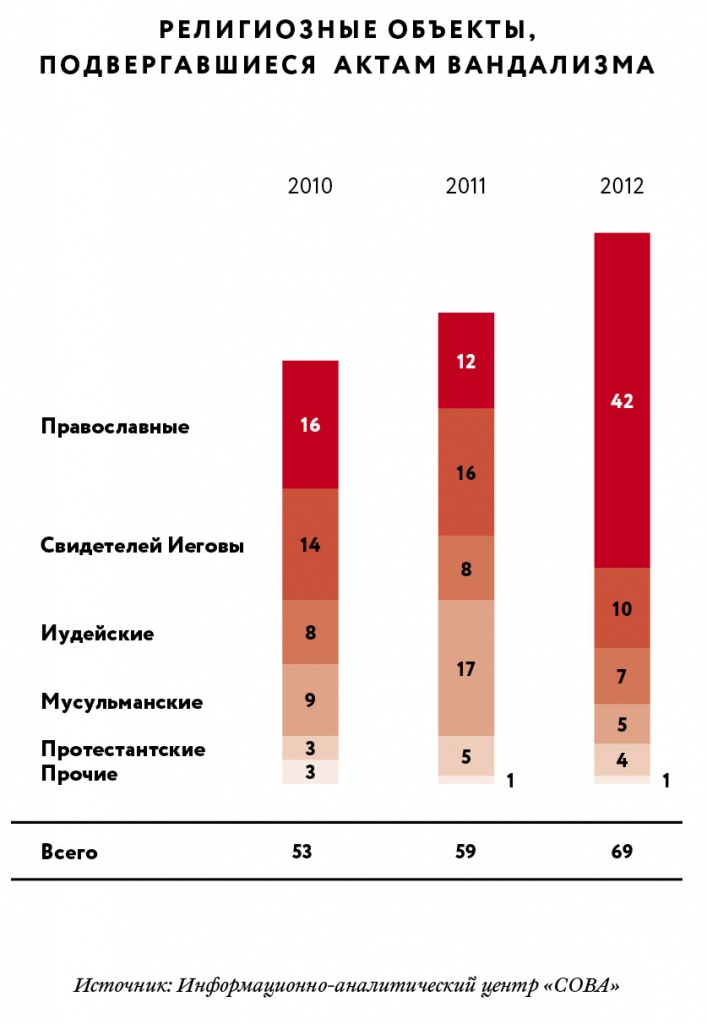 Главной темой нового доклада информационно-аналитического центра «СОВА» стало сближение института государства с Русской православной церковью, рост антиклерикальных настроений в обществе и всплеск вандализма по отношению к православным объектам. А главной отличительной особенностью минувшего года авторы назвали деятельность активистов, нападающих на граждан и культурные объекты под предлогом «защиты святынь»: «Власти и активизация процерковных активистов» — так называется этот раздел доклада.