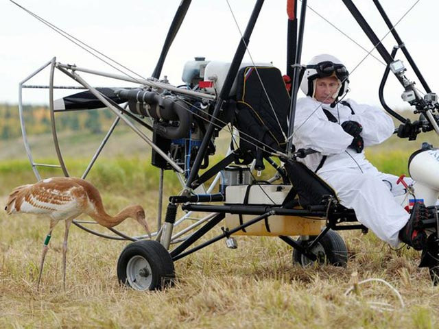 Владимир Путин принял участие в эксперименте в рамках проекта "Полет надежды" 6 сентября 2012 года. Проект предполагал проводку выращенных в питомнике птенцов стерха с гнездовий в ЯНАО через Западную Сибирь и Казахстан на юг Узбекистана. Президент, находясь за штурвалом мотодельтаплана, совершил три полета под Салехардом, из которых два были с журавлями-стерхами. Смысл акции состоял в том, чтобы приучить выросших в неволе птиц следовать за вожаком.