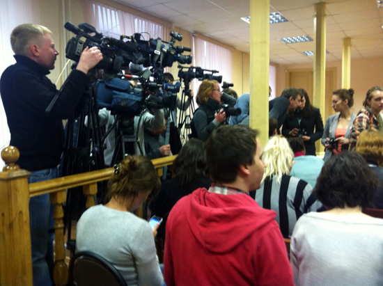 Какой разительный контраст между толкучкой на ступенях суда и атмосферой внутри здания! Как будто попадаешь не в суд, а на прием. Вежливые приставы, проверяющие сумки, улыбающиеся девушки в форме, переписывающие паспорта. Каждому вошедшему объясняют, где гардероб и куда проходить в зал. Снимать можно всех, все и везде — правда, в кадре в основном коллеги.