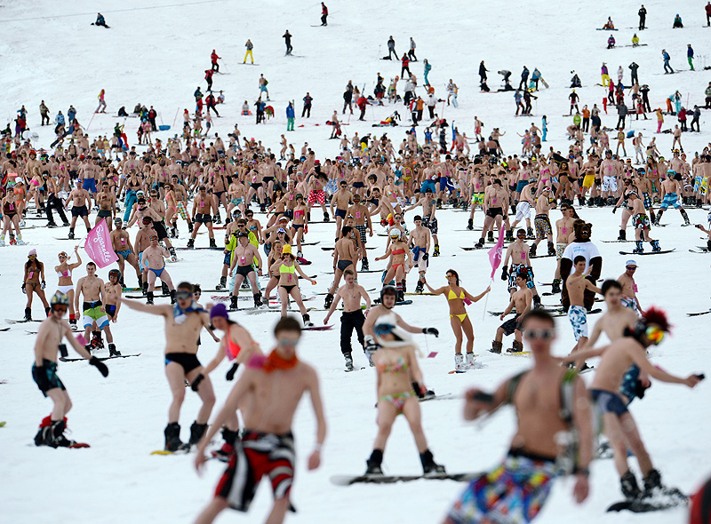 Фото: Александр Кряжев/РИА Новости В эту субботу, 20 апреля, в полдень около 700 человек нарядились в плавки и купальники и спустились на лыжах и сноубордах со склона горы Зелена в поселке Шерегеш в Кемеровской области, сообщают "Новости Кузбасса".