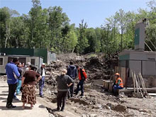 Оползень двигается с такой скоростью, что рабочие даже не успевают проложить коммуникации в вырытую траншею: туда постоянно сваливается новый грунт. Они каждый раз просто выбирают землю экскаватором и складируют рядом. Местные жители бьют тревогу: вот-вот в эту яму "нырнут" их дома.