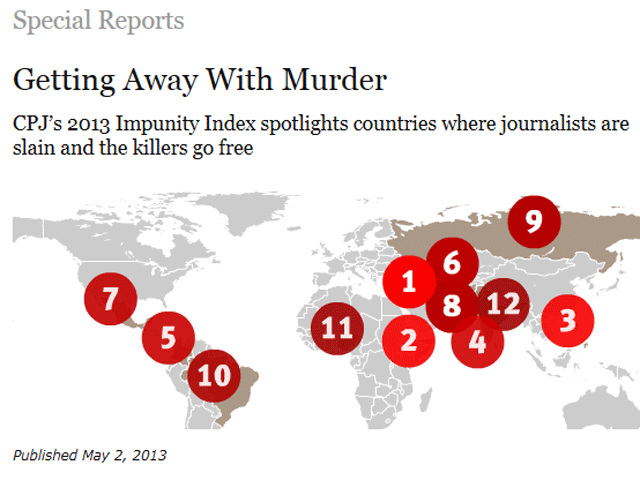 "Индекс безнаказанности" Комитета по защите журналистов определяет процентное соотношение числа нераскрытых убийств журналистов к численности населения страны. При составлении данного выпуска CPJ проанализировал нераскрытые убийства журналистов за период с 1 января 2003 года по 31 декабря 2012 года. В Индексе учтены только те страны, в которых зафиксировано пять или более нераскрытых убийств.