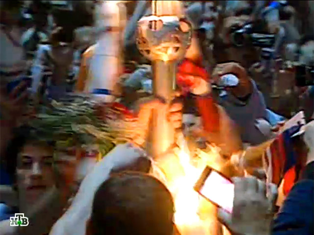 Огонь появился в алтаре во время молитвы патриарха Иерусалимского Феофила, сообщает "Интерфакс". В народе существует предание: если огонь не сойдет, это станет ужасным предзнаменованием для всего человечества, а те, кто находится в храме, погибнут.