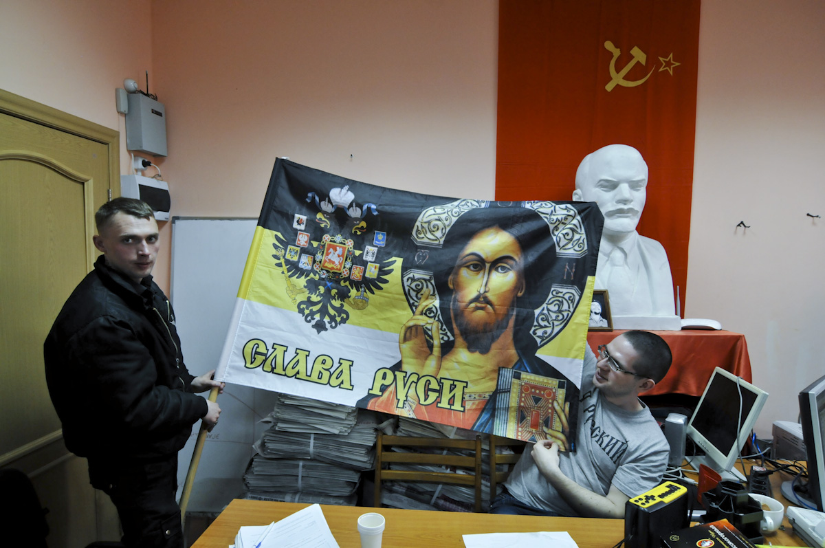 Обстановка дошла до того градуса откровения, что я задал, наконец, вопрос, мучивший меня весь день: "Почему в горкоме компартии красные и желто-бело-черные знамена хранятся в общем углу, а люди с красными бантами поют песни хором с юношами в черном и с татуировкой "Русь" на худой шее?"