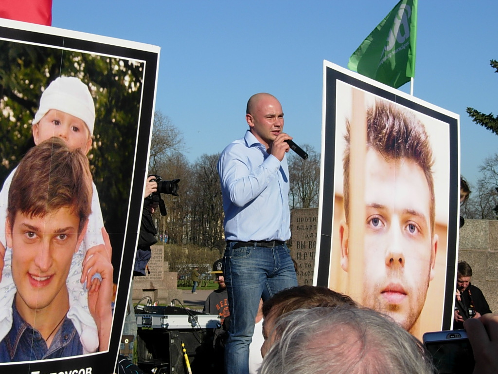 22:31 6.5.2013 В Петербурге на Марсовом поле прошел согласованный митинг в поддержку узников "болотного дела". Он собрал более двух тысяч человек. В толпе были заметны люди в белых футболках с надписями: "Я был на Болотной и приду ещё", "Болотное дело – дело против НАС!", несколько волонтеров надували гелием и раздавали приходящим на митинг белые воздушные шары с лозунгами "Беспорядков на Болотной не было!", "Свободу узникам Болотной", "6 мая ОМОН избивал мирных граждан", "Питер против Путина". Выступления звучали очень искренне и эмоционально, причем выступали не только организаторы акций и участники оппозиционных партий и движений, но и обычные люди, для которых важно было заступиться за арестованных по "болотному делу" и выразить свою гражданскую позицию.Женщины Болотной: сестра Михаила Косенко, мама Ильи Гущина, мама Дениса Луцкевича и мама Коли Кавказского #6мая twitter.com/sovkusomsahara…