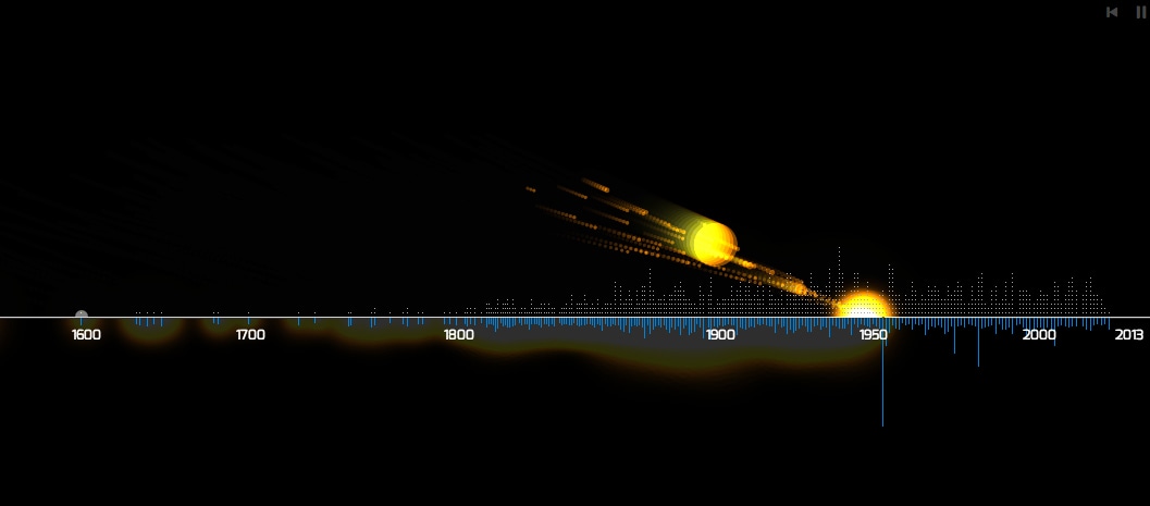 BOLIDES — это попытка визуализации и исследования метеоритов, упавших на Земплю. С помощью анимации и интерактивного интерфейса можно посмотреть на падающие на Землю метеориты в хронологической последовательности.