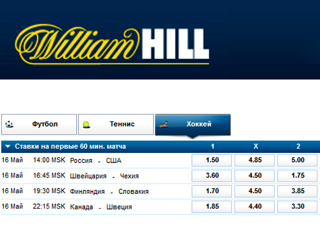 Согласно котировкам, опубликованным британской букмекерской конторой William Hill, сборная России по хоккею является явным фаворитом матча с национальной командой США, который пройдет в рамках 1/4 финала чемпионата мира.