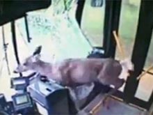 На ВИДЕО: олень пробил лобовое стекло едущего автобуса и вышел через дверь