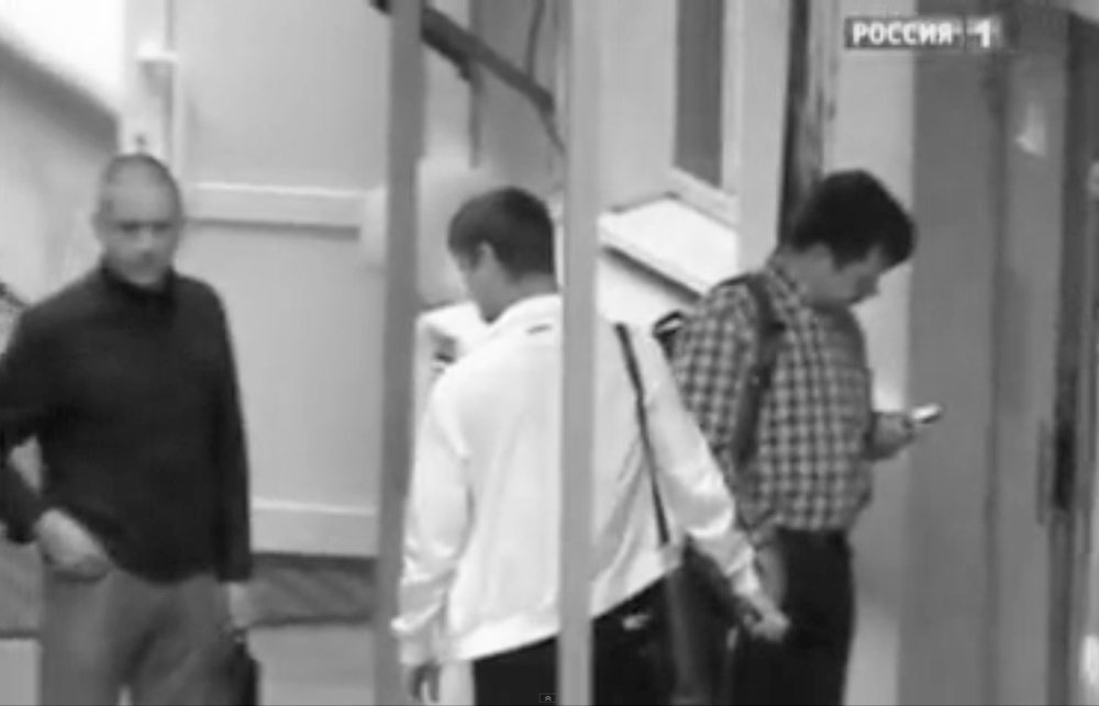 На экране: Человек, похожий на Константина Лебедева, выходит из машины с сумками. Рядом с ним человек, похожий на Сергея Удальцова. Они подходят к подъезду какого-то дома. Голос за кадром: «Это двор жилого дома в центре Минска. Нам кажется, было бы странным утверждать, будто бритоголовый мужчина лишь похож на Сергея Удальцова».