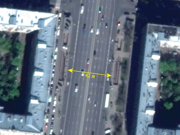 Возьмем тот же Проспект Мира, на котором мы планируем вернуть трамвай. Прежде чем резать-убивать, давайте посмотрим, что с полосностью. Ого, 42 метра! При этом по 5 полос в каждую сторону.