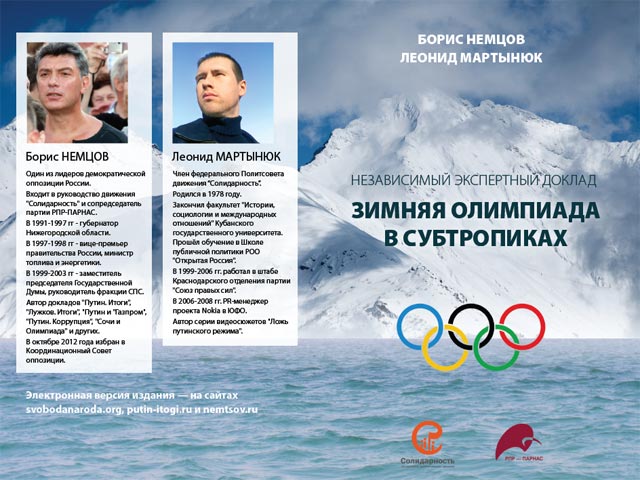 Пока российские власти хвалятся перед всем миром подготовкой Олимпиады-2014 в Сочи, оппозиция клеймит самую дорогую в мире спортивную стройку, называя ее "чудовищной аферой в истории современной России" и "грабежом страны в чистом виде". Сопредседатель партии РПР-ПАРНАС Борис Немцов и член политсовета движения "Солидарность" Леонид Мартынюк в четверг представили готовившийся полгода доклад "Зимняя Олимпиада в субтропиках" (доступен на сайте Немцова и его партии, а также на сайте "Путин. Итоги", где публиковались известные одноименные доклады).