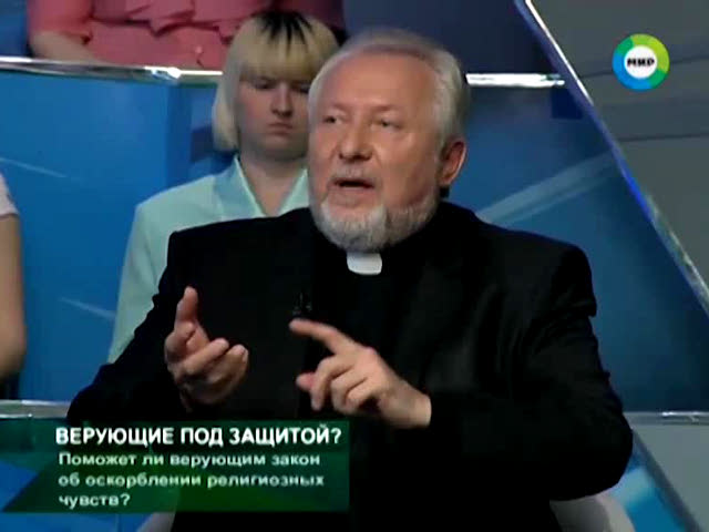 Член Общественной палаты РФ и Совета по взаимодействию с религиозными объединениями при президенте РФ, начальствующий епископ Российского объединенного союза христиан веры евангельской (РОСХВЕ) Сергей Ряховский предложил изменить формулировку , посвященной принятому недавно во втором чтении законопроекту. Серьезную дискуссию среди участников эфира вызвало само понятие "чувства" и то, как оценивать наличие оскорбления. Приводились различные примеры как реальных случаев, так и гипотетических ситуаций, которые могут стать предметом разбирательств в рамках предлагаемого закона.
