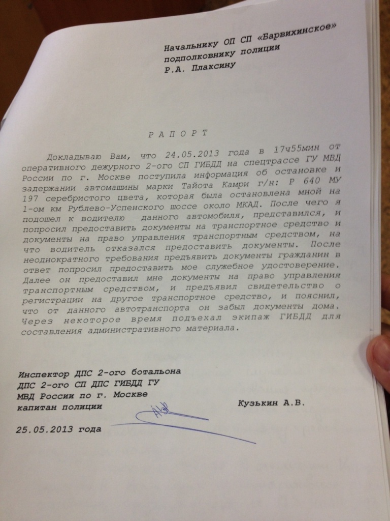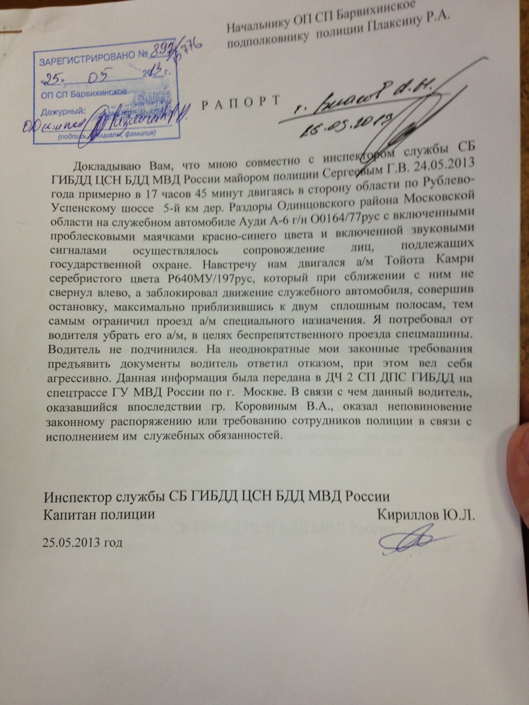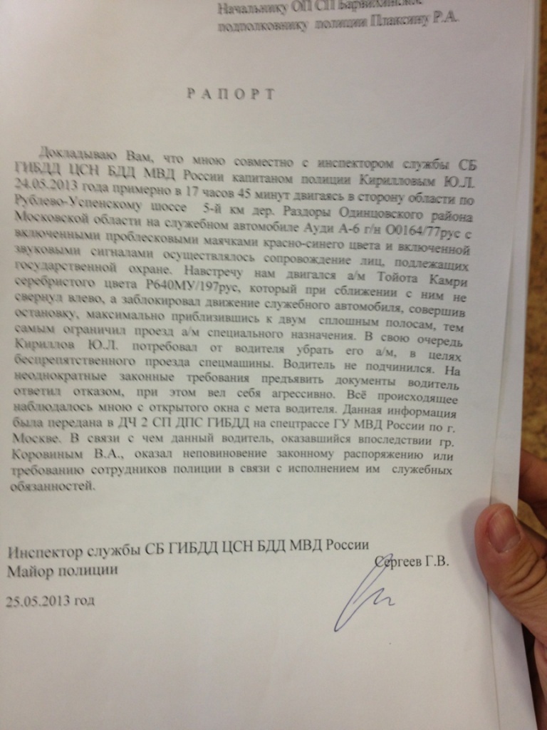 В рапортах от 25 мая 2013, написанными обоими сотрудниками машины сопровождения неизвестного высокопоставленного чиновника, указано, что автомобиль Коровина заблокировал движение их колонны. При этом в своем рапорте Кириллов Ю.Л. не вспомнил о том, что с его ногой что-либо произошло. Также о наезде не вспомнил и Сергеев Г.В. Никакой информации о наезде на сотрудника полиции нет и в рапорте инспектора ДПС Кузькина А.В, который и остановил машину Коровина после того, как получил такое указание. В рапорте заместителя начальника ОП «Барвихинское», принявшего решение о возбуждении административного дела по ст.19.3, тоже ничего не сказано о каких-либо событиях связанных с наездом.