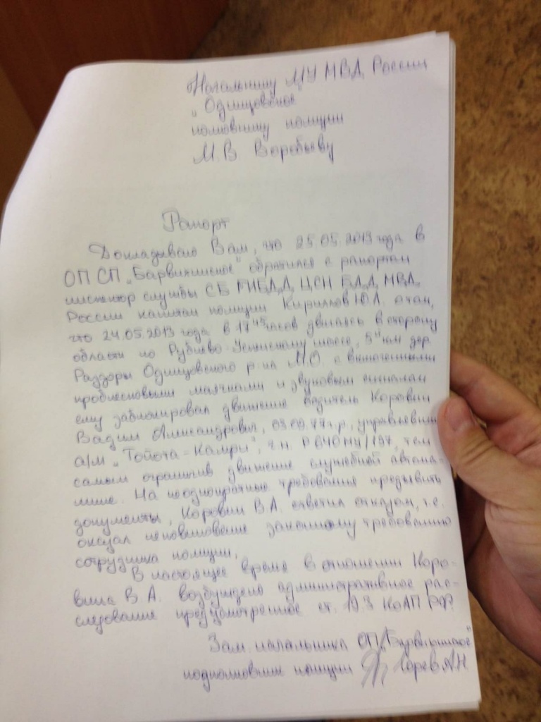 В ночь с 30 на 31 мая активист Федерации автовладельцев России Вадим Коровин был задержан на 48 часов после очной ставки с капитаном полиции Юрием Кирилловым в Главном Следственном Управлении Следственного Комитета России по Московской области. В распоряжении The New Times оказались рапорты полицейских (потерпевшего и свидетелей инцидента на Рублево-Успенском шоссе), а также видеозапись, на которой запечатлен якобы пострадавший от действий Коровина сотрудник ГИБДД
