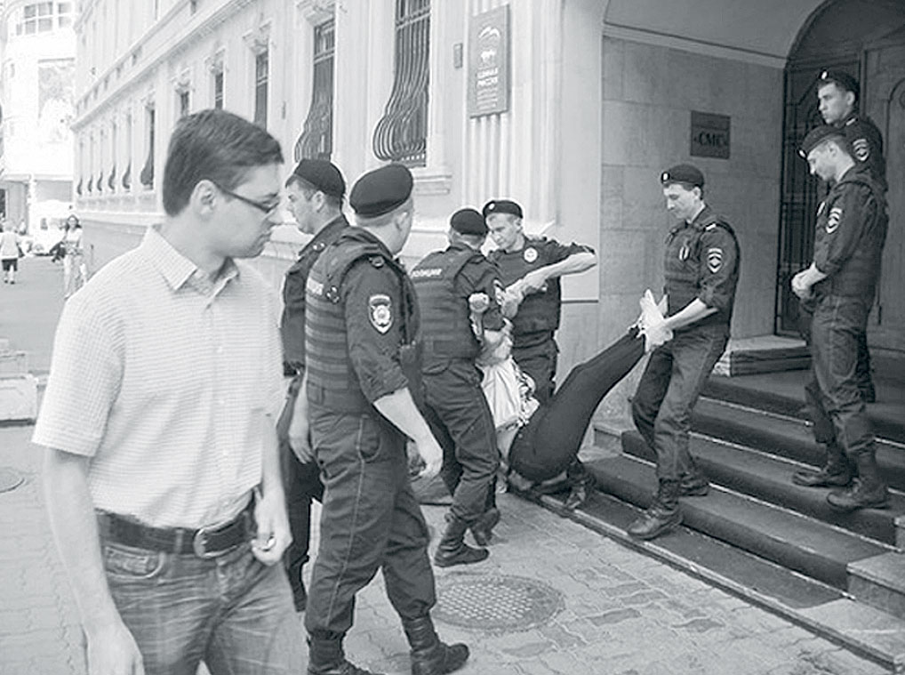 Мы вернулись на крыльцо здания ЕдРа и спокойно просидели там меньше десяти минут. А потом — новый шквал ОМОНа: нас схватили за руки и за ноги, эти же самые мальчики! И забрали нас обратно в ОВД, причем на этот раз церемонились еще меньше — мы остались с синяками. В Мещанском ОВД у нас отобрали телефоны, чтобы мы не смогли позвонить адвокатам. Но группа поддержки ночевала у дверей всю ночь. Полицейские очень боялись огласки.
