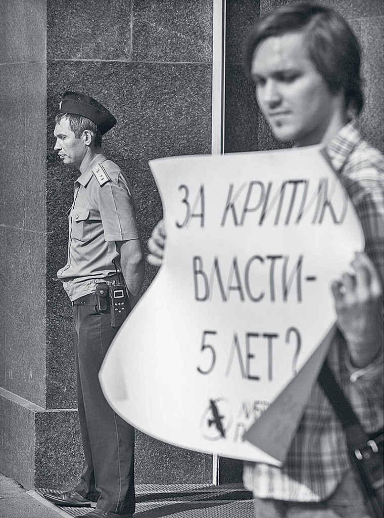 | Декриминализация клеветы стала одной из первых инициатив Медведева, отмененных после его ухода с поста президента (на фото — пикет у здания Госдумы в июле 2012 года |