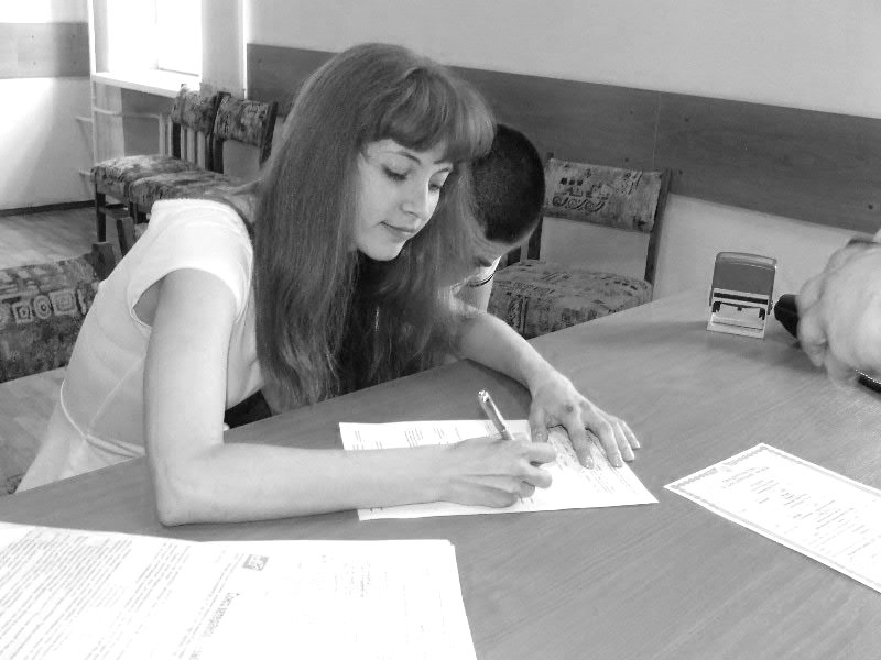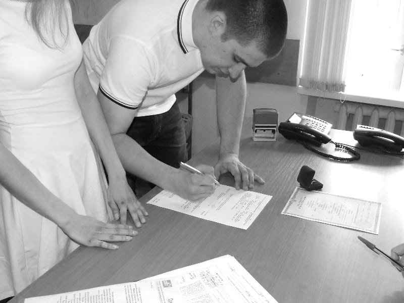 Он входит в комнату, улыбается родителям и деду, обнимает невесту. Сотрудница ЗАГСа Екатерина раскладывает на столе бумаги, достает из сумки розовое свидетельство о браке. Жених и невеста сидят рядом, сцепив руки, и, не отрываясь, смотрят друг на друга.