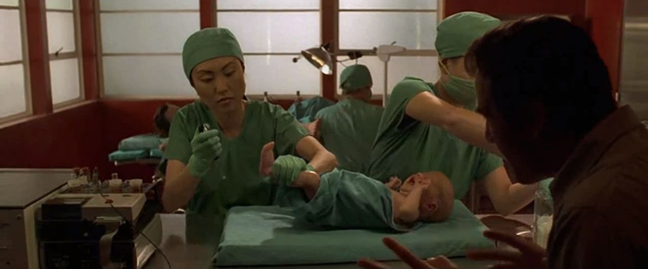 Кадр из фильма «Гаттака»Антиутопия в виде общества, овладевшего генными технологиями, показана в американском художественном фильме «Gattaca», фрагменты которого были продемонстрированы в ходе лекции. Главный герой был зачат «обычным» путем, без предварительного генетического исследования, и сразу же после рождения анализ его генома выявил высокий риск сердечных заболеваний и вероятную продолжительность жизни около 30 лет. В показанном в фильме обществе генотип ребенка предпочитают планировать заранее, составляя при помощи генной инженерии оптимальную комбинацию из генов его родителей. Те, в чьих генах есть нежелательные свойства, не могут сделать карьеру, так как анализ геном стал обычной процедурой при приеме на работу, и становятся изгоями.