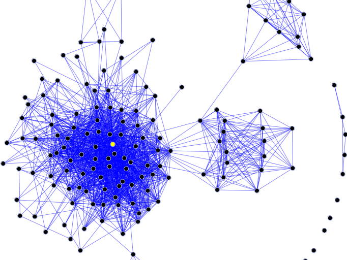 К Зиммелю мое понимание восходит, а двумя ногами оно стоит в эмпирическом сетевом анализе, и определение, таким образом, будет сетевым. Сообщество – это фрагмент социальной сети с высокой плотностью связей между индивидами. То есть, интенсивность общения между членами сообщества будет выше, чем между членами и не-членами этого сообщества. Вот, например, на рисунке, на котором точки – это люди, а линии – связи между ними, можно увидеть как минимум четыре сообщества. Принципиальное отличие этого подхода к сообществу от подхода, который формулирует Павел, состоит в том, что он пытается искать тип отношений, который будет создавать сообщество, для меня же важна структура отношения – вне зависимости от того, какого эти отношения типа и какие сообщения передаются с их помощью.