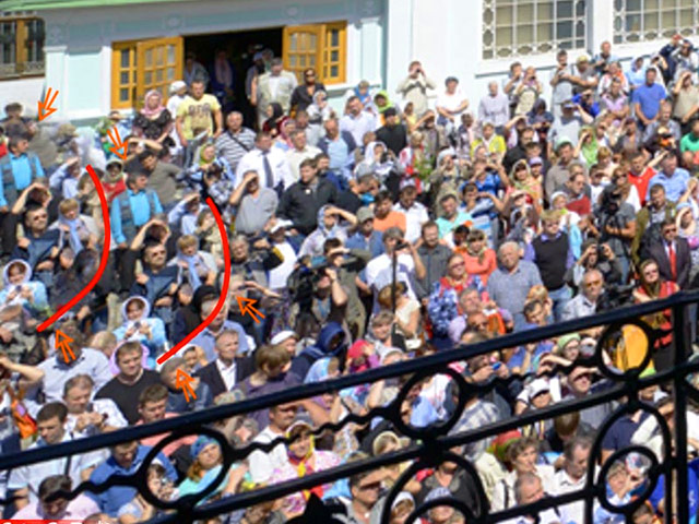 На фотографии, из-за которой разгорелся весь сыр-бор, видно, как патриарх Кирилл с балкона проповедует перед толпой прихожан, которая заняла всю площадь. А в левом нижнем углу дотошные пользователи обнаружили, что одни и те же лица повторяются несколько раз. Рассмотреть отредактированный вариант в подробностях можно в блогах ibigdan и cybergo_ru.