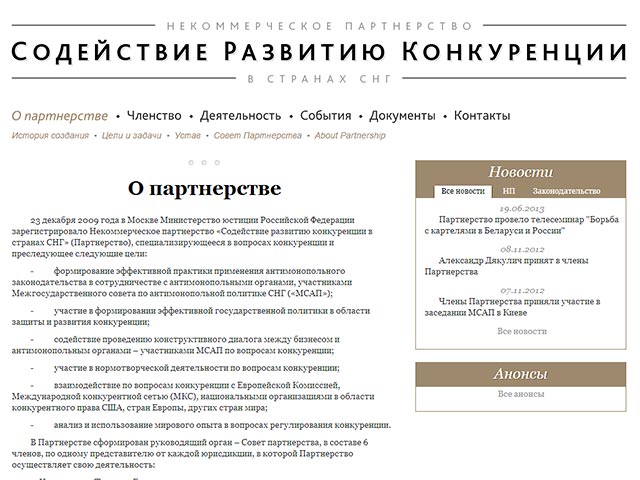 Согласно официальному сайту организации, которая располагается в Москве на Ломоносовском проспекте, некоммерческое партнерство "Содействие развитию конкуренции в странах СНГ" зарегистрировано в Минюсте России 23 декабря 2009 года. НКО специализируется в вопросах конкуренции, занимается формированием эффективной практики применения антимонопольного законодательства в сотрудничестве с антимонопольными органами, участниками Межгосударственного совета по антимонопольной политике СНГ ("МСАП").