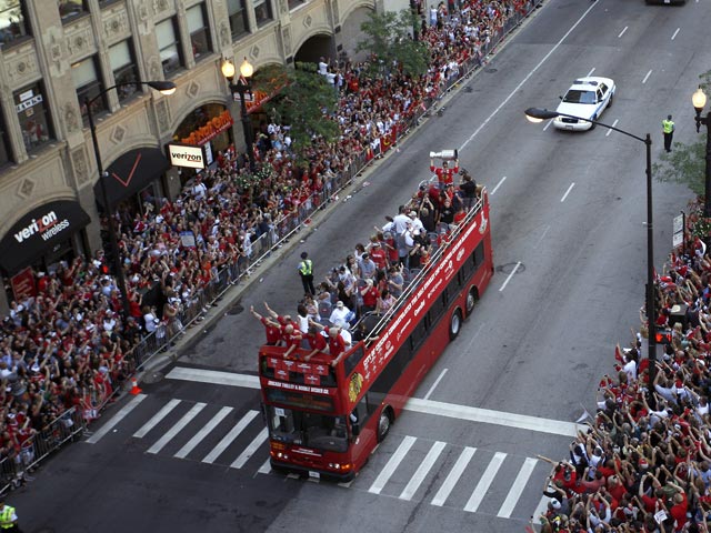 По данным полиции Чикаго на чествование чемпионов собралось более двух миллионов человек, сообщает ESPN. На головном автобусе с Кубком в руках всех собравшихся приветствовал капитан "ястребов" Джонатан Тэйвз.