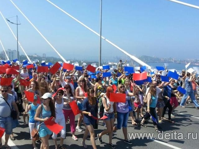 Грандиозный флешмоб "Я люблю Владивосток" начался на Золотом мосту города в два часа дня по местному времени (07:00 мск). 12 тысяч участников акции выстроились в надпись "I love Vladivostok", и почти 27 тысяч горожан на другой половине моста 5 минут держали в поднятых вверх руках красные, синие и белые флажки, образовав государственный флаг России, передает ИТАР-ТАСС.